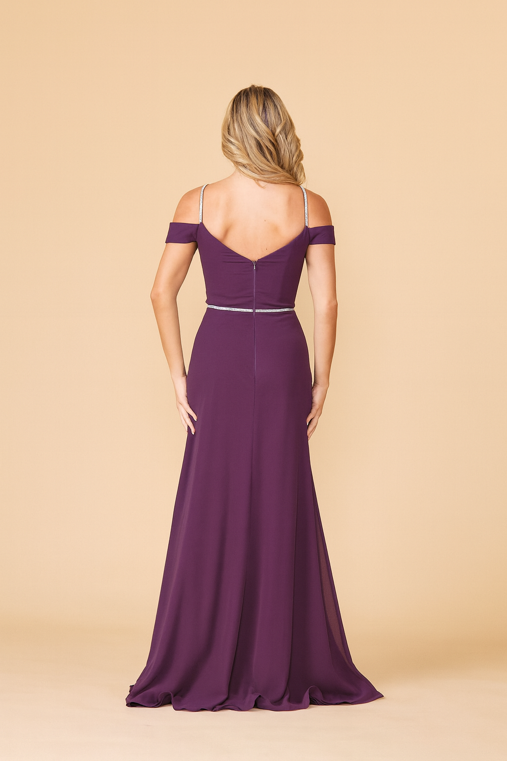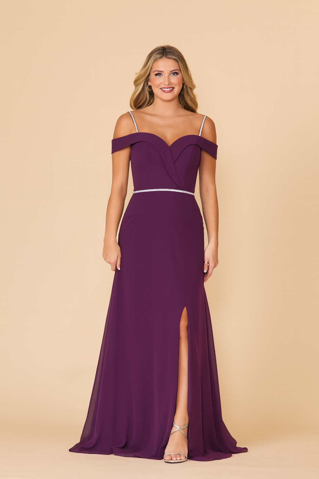 Turn heads in this timeless off-shoulder evening gown, designed in a rich grape purple hue that exudes sophistication. The sweetheart neckline is accented with delicate rhinestone straps for a touch of sparkle, while the off-the-shoulder sleeves add a romantic flair. A slim rhinestone belt cinches the waist, creating a flattering silhouette that flows into a graceful floor-length skirt with a subtle slit for ease of movement. Crafted in lightweight chiffon, this dress is perfect for formal occasions, weddings, or any event where you want to make a stunning impression.