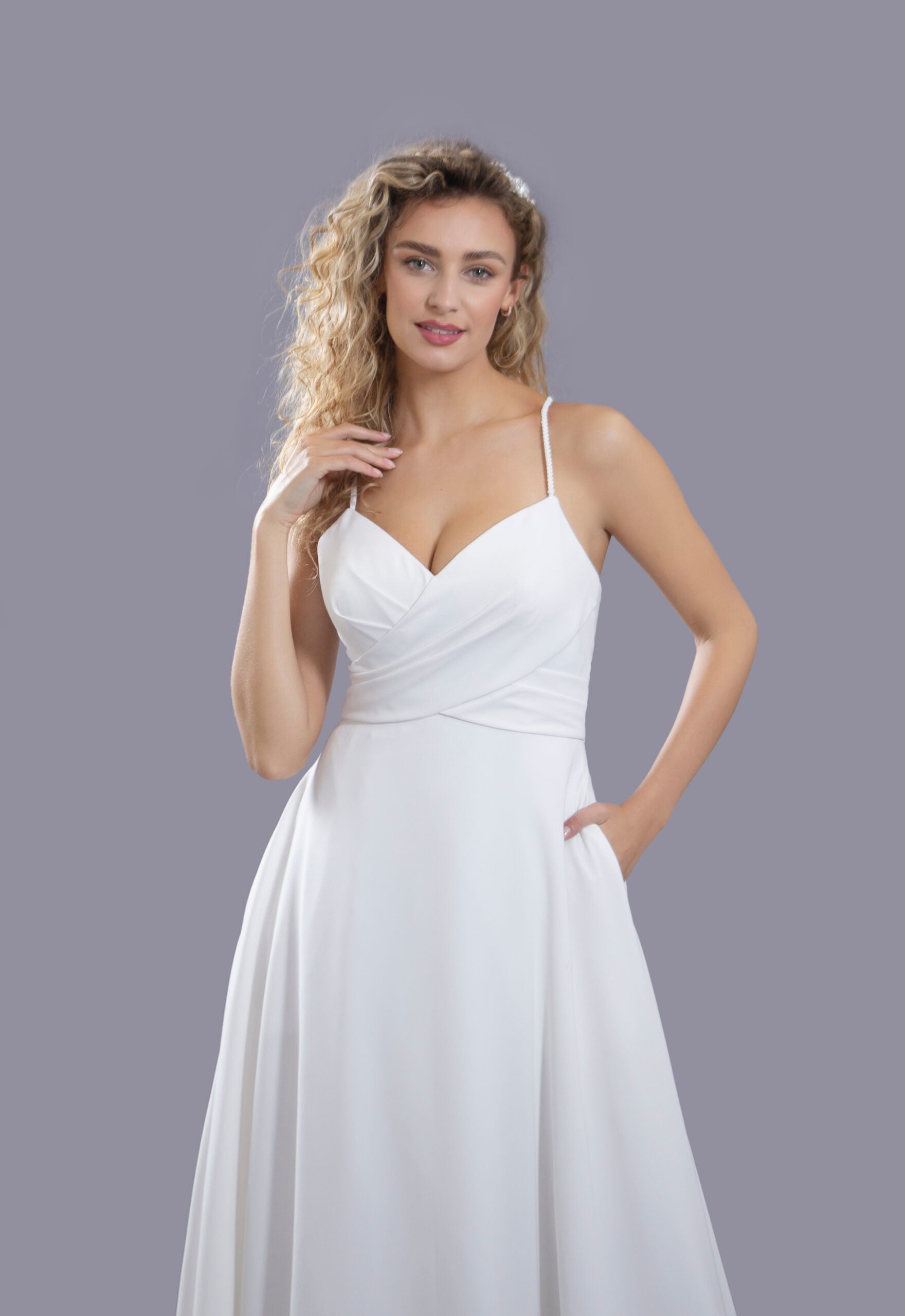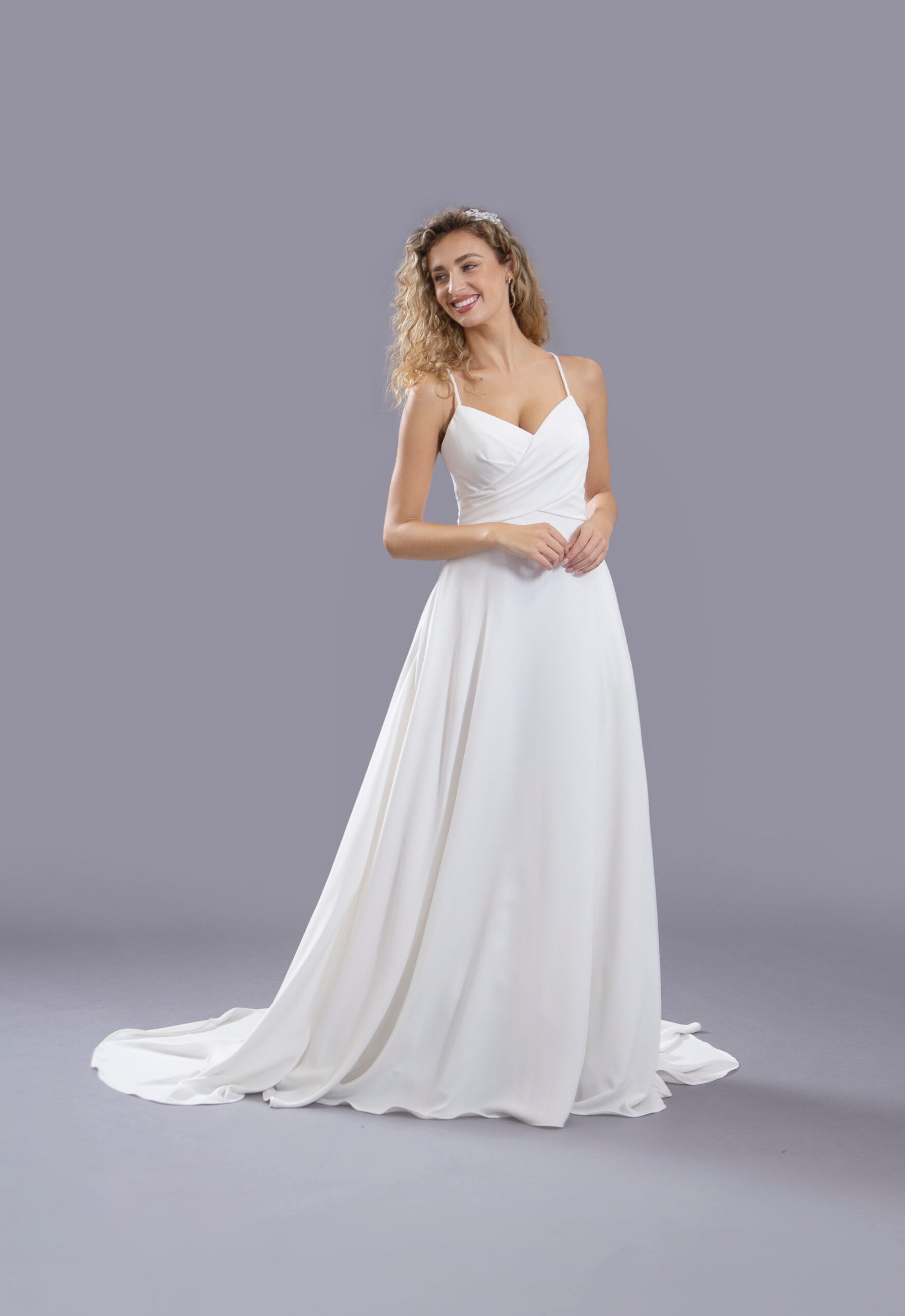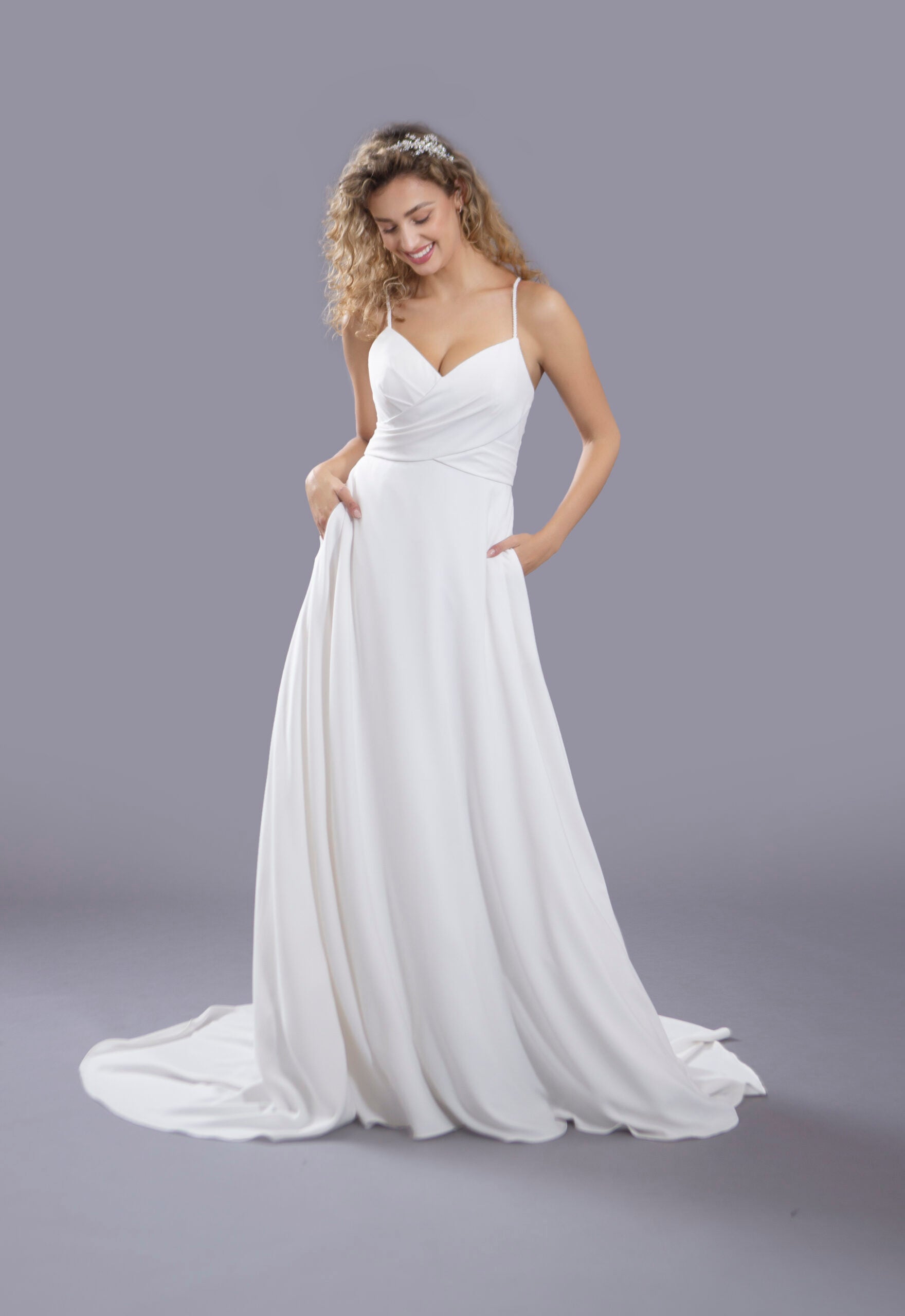 A dreamy, modern classic, this gown features a soft A-line silhouette with a pleated bodice that flatters the bust and waistline. The delicate beaded spaghetti straps add subtle sparkle, complementing the gown’s refined simplicity. Hidden side pockets add a contemporary and practical touch, while the flowing skirt offers effortless elegance. Finished with a discreet zip closure, this dress is ideal for brides seeking a balance of comfort, grace, and understated glamour.