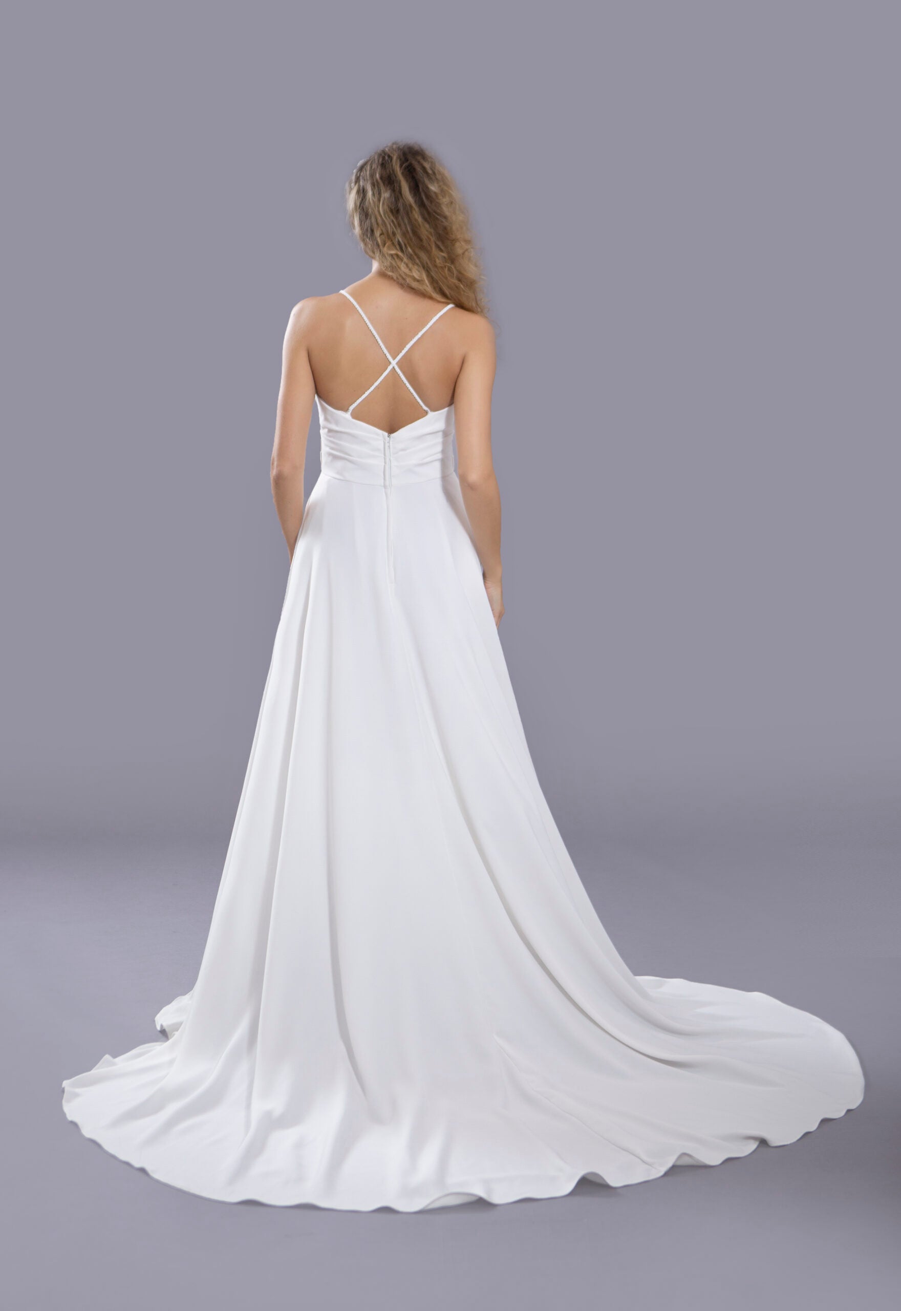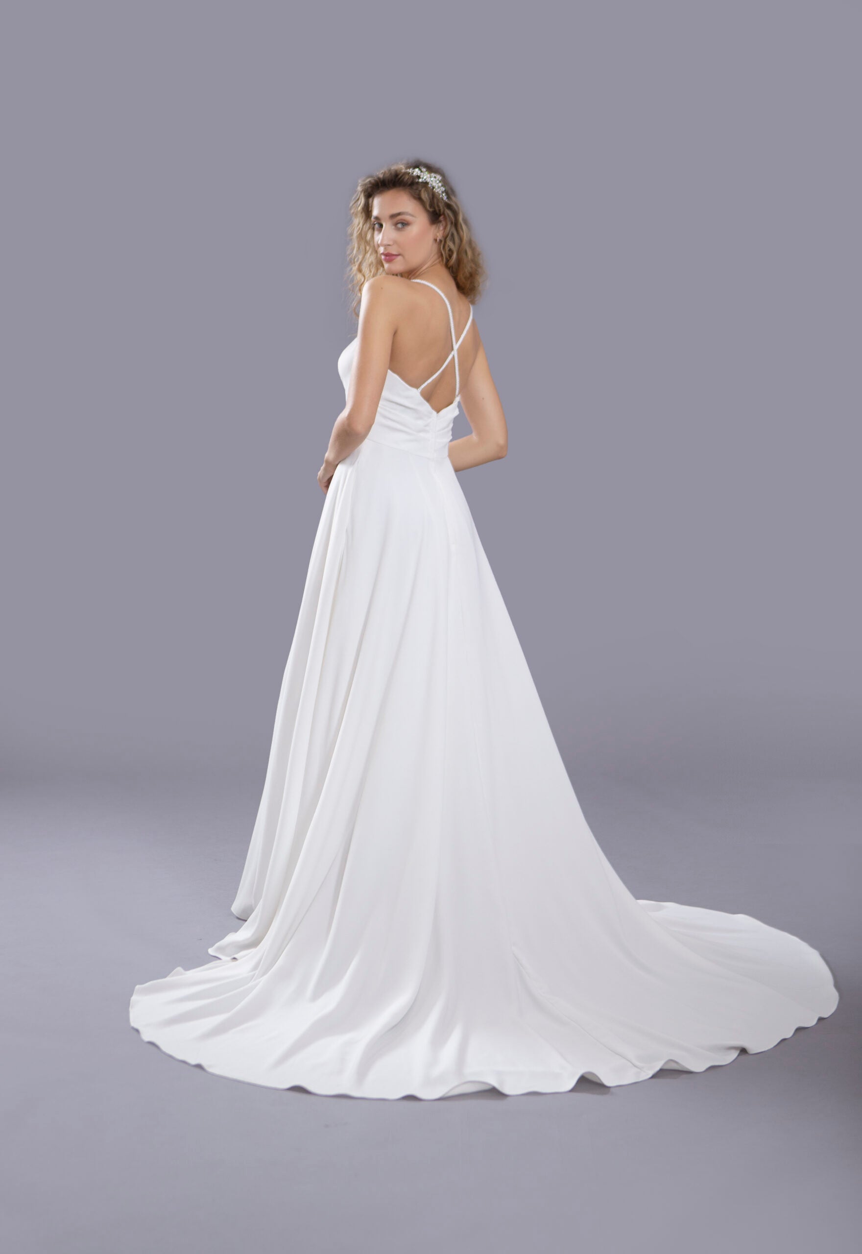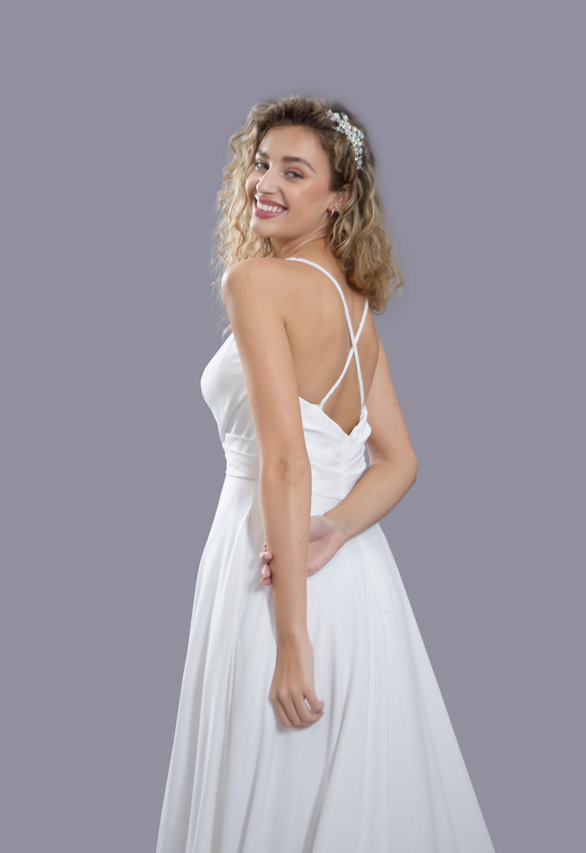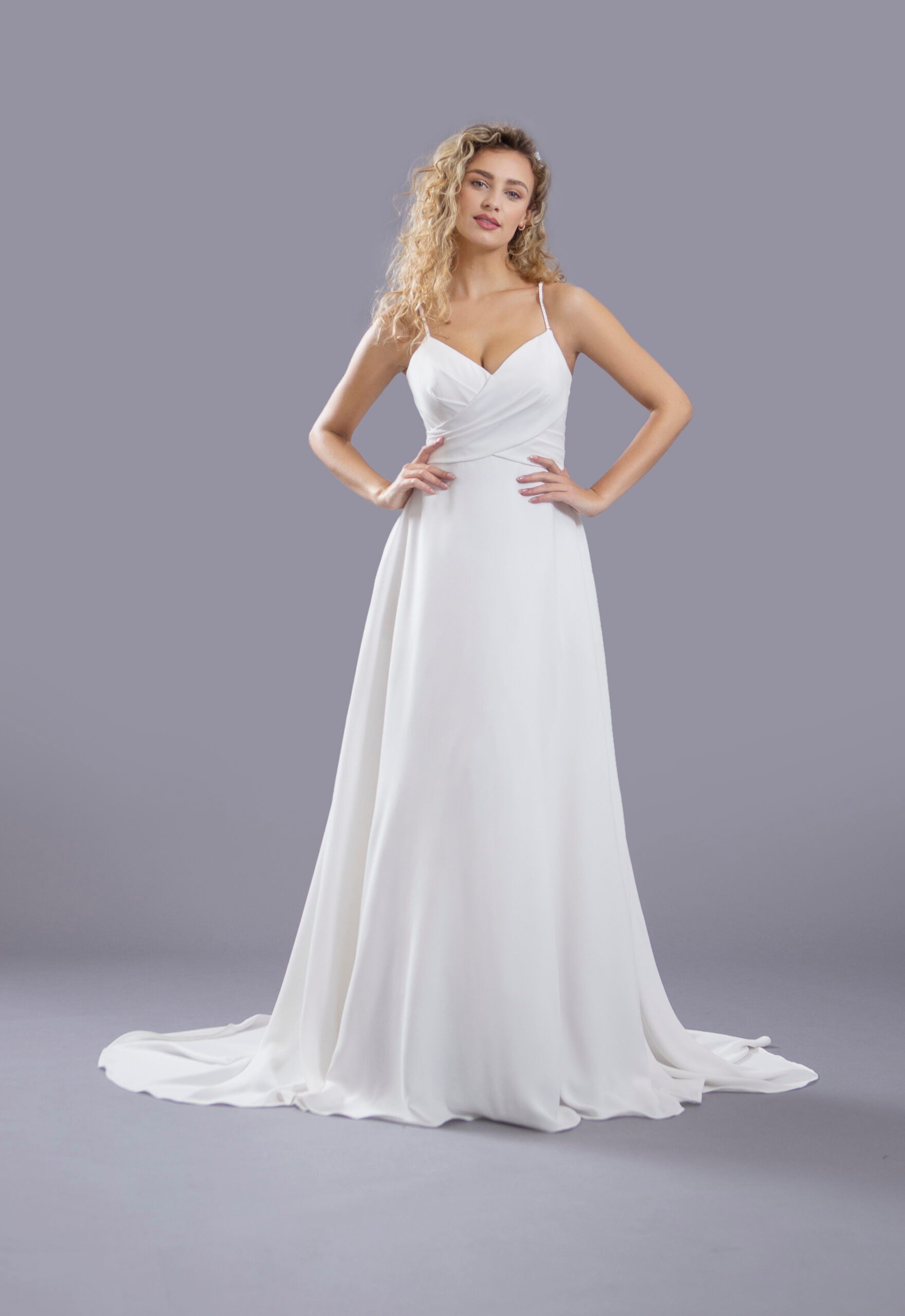 A dreamy, modern classic, this gown features a soft A-line silhouette with a pleated bodice that flatters the bust and waistline. The delicate beaded spaghetti straps add subtle sparkle, complementing the gown’s refined simplicity. Hidden side pockets add a contemporary and practical touch, while the flowing skirt offers effortless elegance. Finished with a discreet zip closure, this dress is ideal for brides seeking a balance of comfort, grace, and understated glamour.