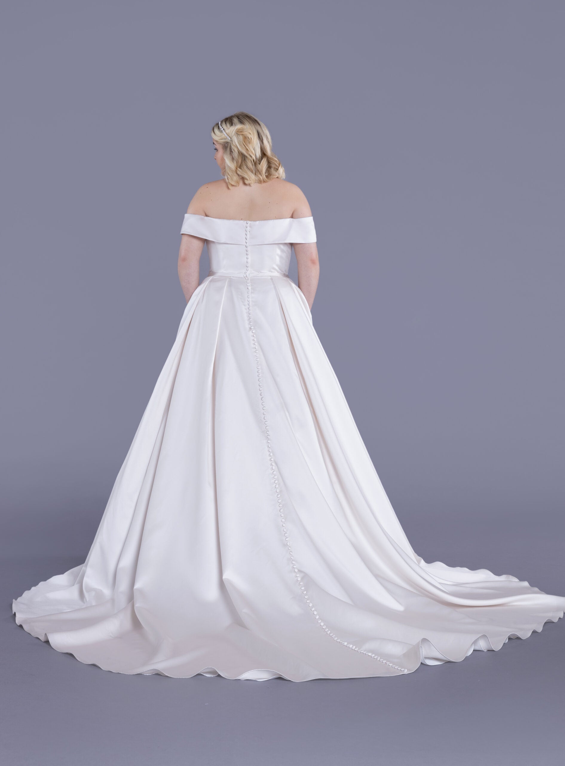 The off-shoulder Bardot neckline softly frames the shoulders and collarbone, adding a touch of romance. A structured bodice shapes and supports, highlighting the waist and enhancing natural curves. From there, the full A-line skirt flows beautifully with delicate pleats, finished with a sweeping train for dramatic impact.