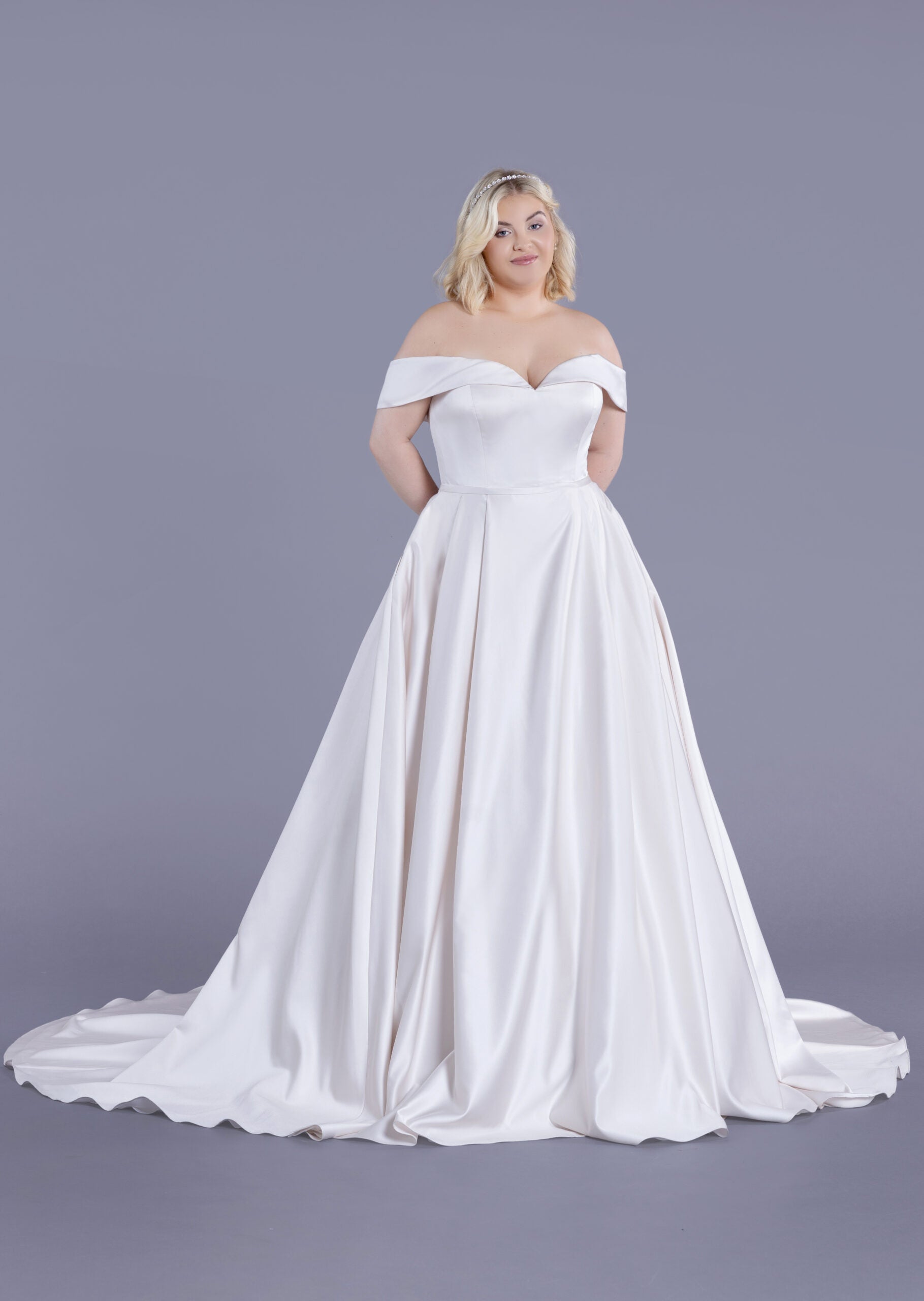 Expertly tailored for fuller figures, every detail is designed with comfort and confidence in mind. Whether your celebration is in a grand church, a modern venue, or a dreamy destination, this versatile gown complements any setting. Style it your way with a dramatic veil, pearl accessories, or a chic satin sash.