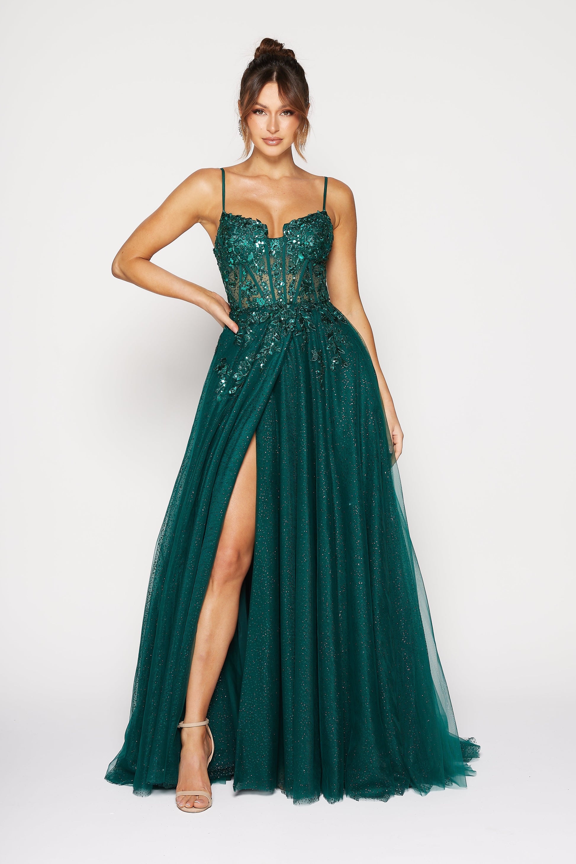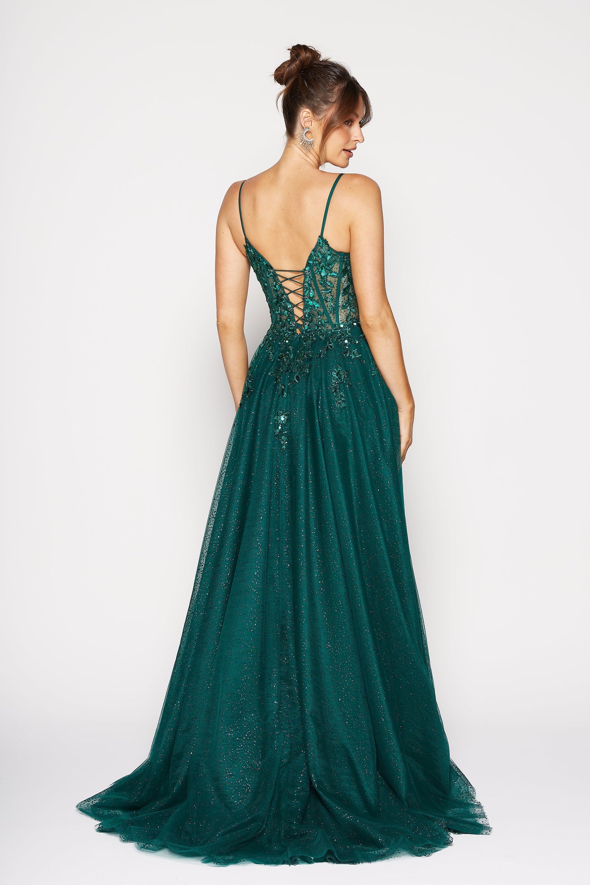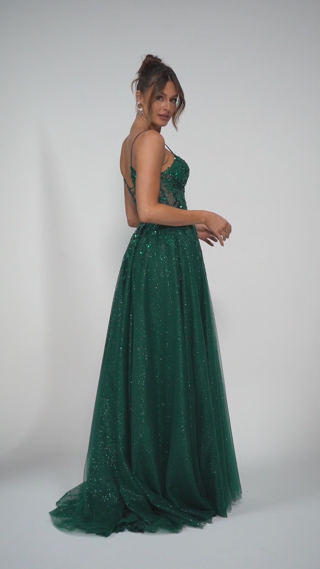 A mesmerizing blend of modern allure and classic sophistication. Crafted from exquisite glitter tulle and adorned with delicate lace appliqué.